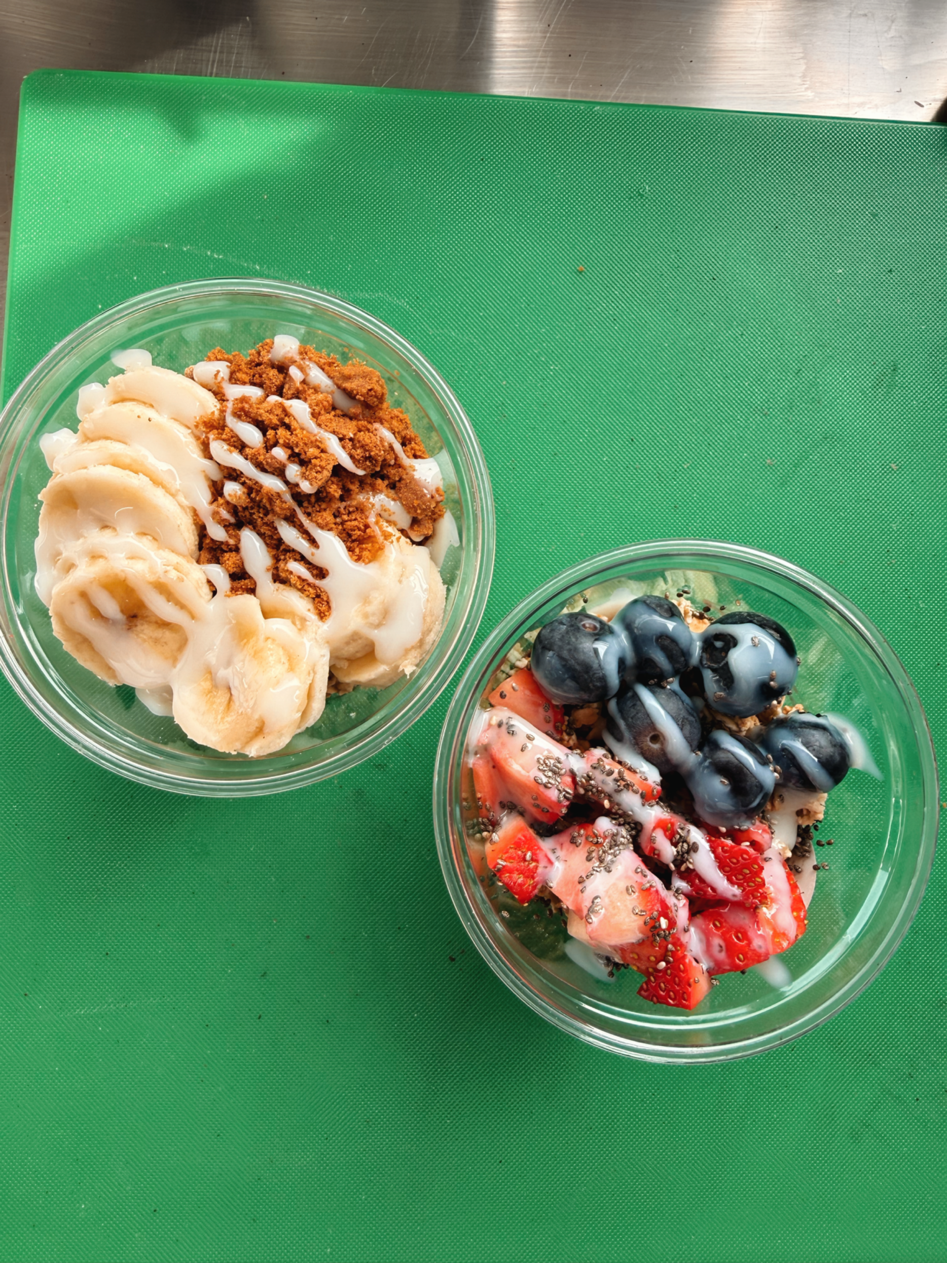Dive into our classic açaí bowls, a refreshing base waiting for your personal touch. Each day, we feature an array of fresh fruit toppings including strawberries, bananas, blueberries, raspberries, and kiwi. Don't forget to add your favourite sauce: choose from Nutella, Biscoff, creamy peanut butter or honey. The açai itself is vegan, gluten free and dairy free too so everyone is able to enjoy!